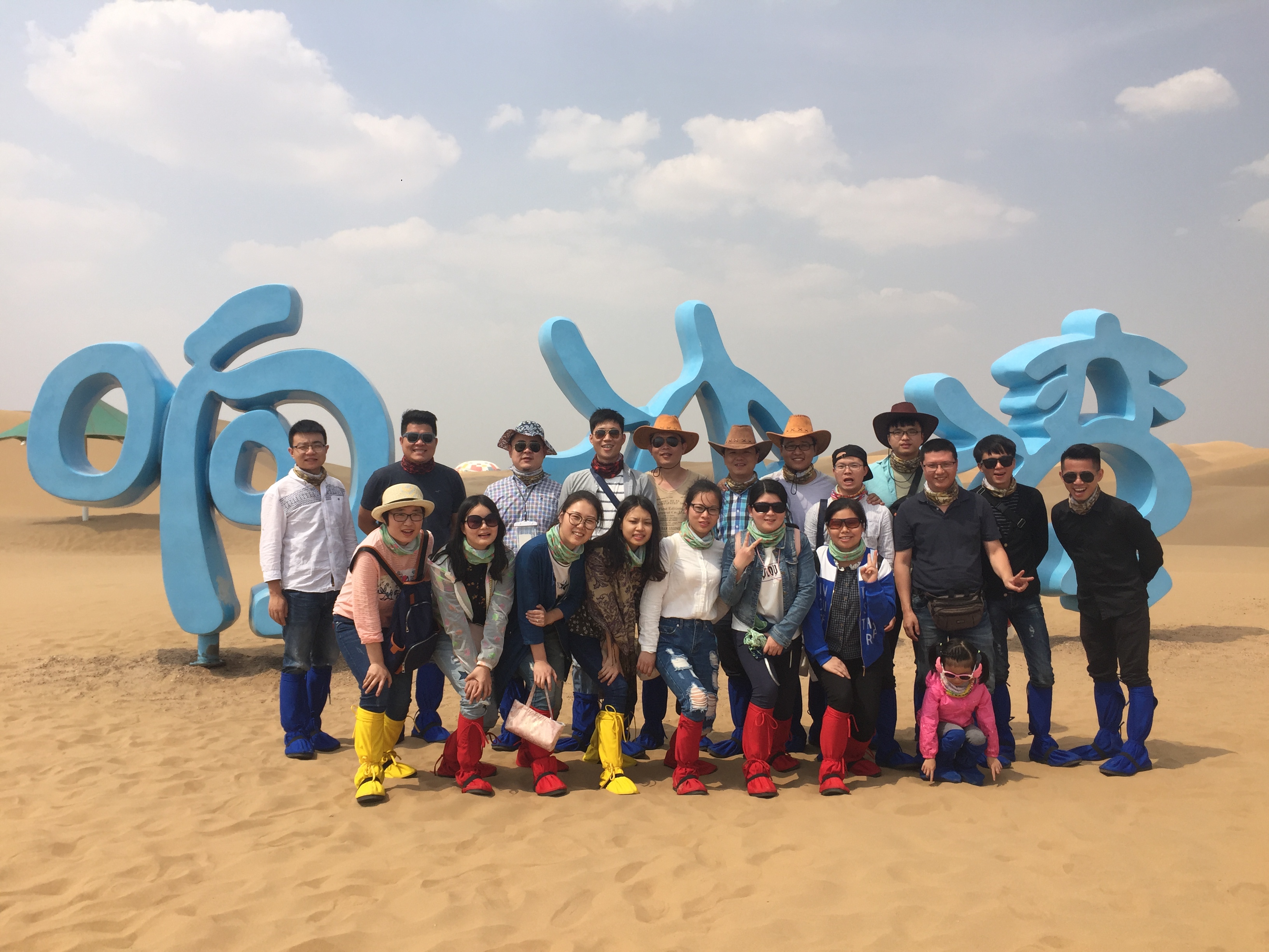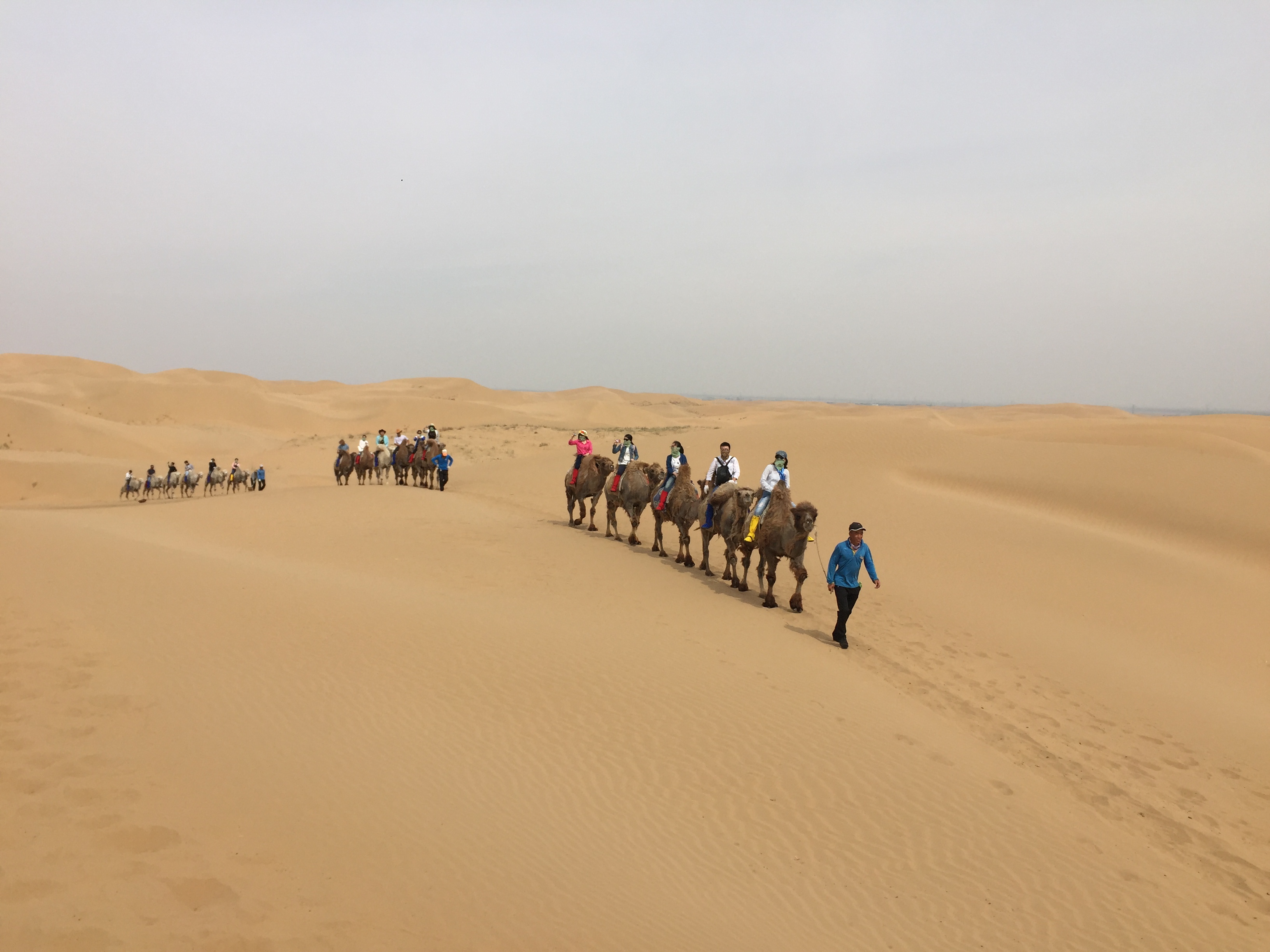 第四天,拋開對草原的留戀以及大汗的敬仰之情,我們繼續前往響沙灣——也是此行最為期待的沙漠之旅;作為西北方特有的地貌,此次也是第一次見到,一眼望去黃澄澄的一片;它不同于大海的波濤洶涌和循環不息,而是一幅寂靜荒涼而悲壯的畫面,震撼著你的心靈。在響沙灣邊緣,我們坐著纜車跨過一條基本干涸了的河床,正式進入沙漠,穿好沙襪,之后乘坐沙漠之舟進入娛樂天堂——仙沙島。在那里,我們可以進行騎駱駝,速滑索道,騎沙漠摩托和滑沙等好玩而又刺激的活動,除此之外還能欣賞大型的雜技表演,飽足眼福。娛樂一圈,大家也都漸漸疲乏,正好返回呼市共享晚餐。